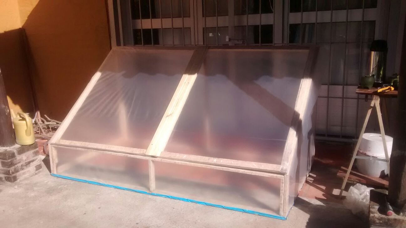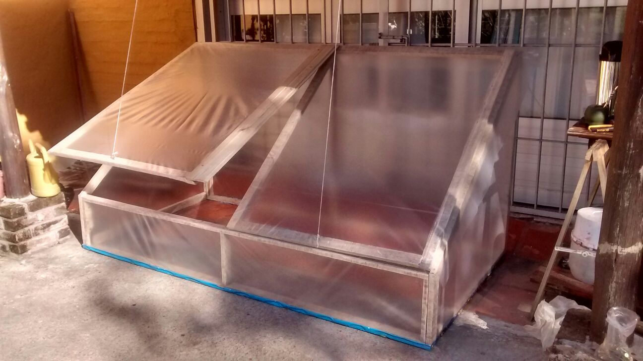 Tiene 2 metros de ancho y 1 metro de profundidad. En ese espacio podemos poner unas cuantas bandejas de semilleros, los tomates, morrones, berenjenas, que vamos a comer este verano.
