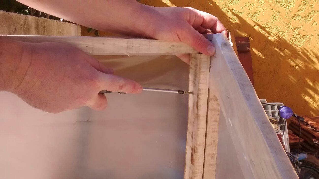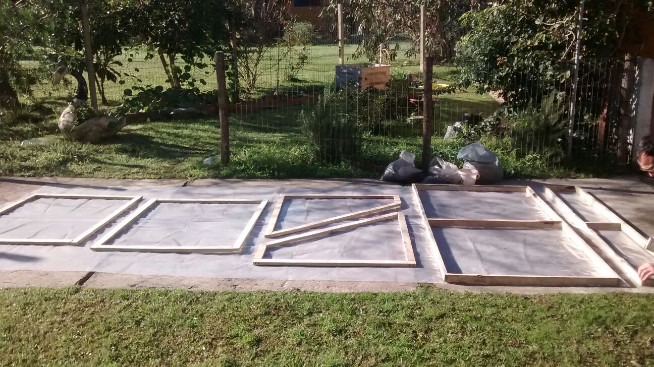 Utilicé alfajías de pino de 2×1 pulgadas, de las de segunda, a 25$ la unidad. Usé 10 alfajías de 3.30 metros de largo. Por 250$ tengo la estructura para armarla. Gasté unos 100$ más en nylon, compré 5 metros de nylon tubular de 1 m de ancho. 100$ más en las grapas y 100$ más en 4 bisagras. Menos de 20 dolares por el invernadero pronto!